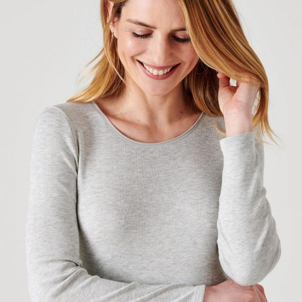 Ce T-shirt manches longues Thermolactyl en fine côte mélange 50% polyester recyclé, 50% acrylique (sauf noir : 50% polyester (dont 45% polyester recyclé), 50% acrylique)) souple 1×1 est revisité d’un biais moderne à l’encolure. Confortable, cet essentiel vous offre la chaleur optimale du mélange Thermolactyl. Il se porte en t-shirt avec un pantalon ou en sous-vêtement avec un bas de pyjama. Biais élastiqué au col rond. Longueur du t-shirt femme 70 cm environ. Passe au sèche-linge. Chaleur Medium 3 : chaleur moyenne, idéale au cœur de l’hiver. ŒKO-TEX STANDARD 100 CQ1194/4 – IFTH.