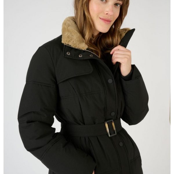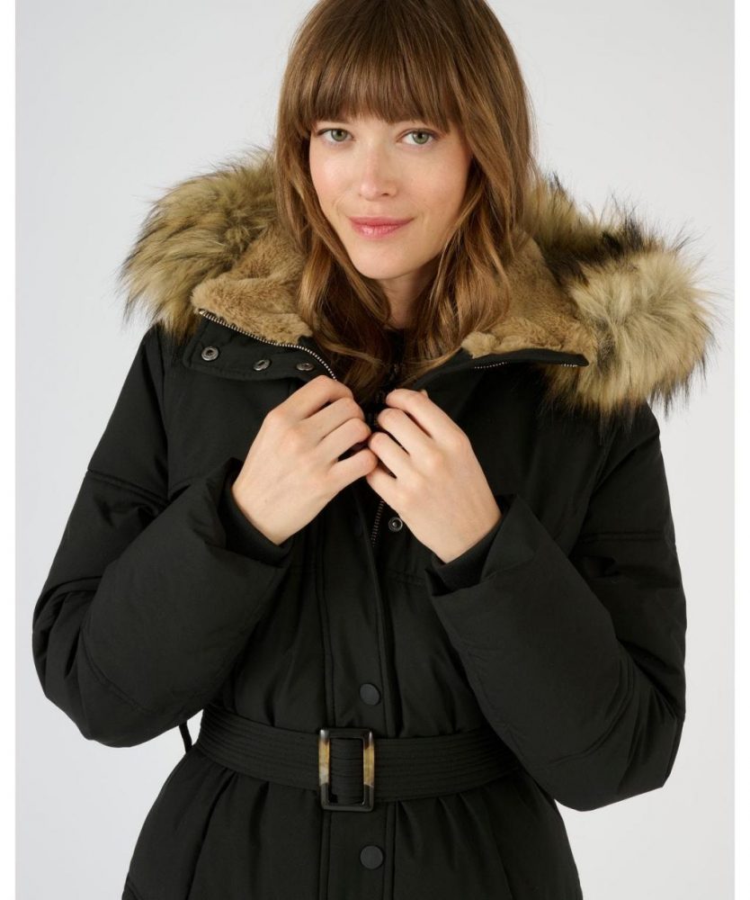 Cette parka femme est sacrément stylée avec son matelassage gonflant animé d’un bavolet sur un côté et d’une belle ceinture à boucle façon corne sous passants. Avec le traitement déperlant de son tissu extérieur et à capuche amovible par glissière et bordée d’une imitation fourrure 100% acrylique (amovible par boutons), vous portez cette doudoune tendance par tous les temps. En plus, la doublure au label Thermolactyl, fabriquée à 53% en polyester recyclé, vous réchauffe toute la saison… tout comme son col montant à l’intérieur tout doux avec son imitation fourrure 100% polyester. Ce manteau hiver femme se ferme par une glissière dissimulée par une patte pressionnée. Il propose deux poches incrustées à l’intérieur doublé polaire, ainsi qu’une poche intérieure fermée par patte auto-agrippante. Bord-côtes intérieur aux poignets. Longueur de cette parka femme 89 cm environ.
